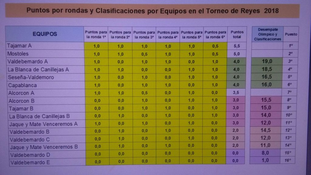 El pasado domingo 7 de enero de 2018 se ha celebrado—organizado por el Club de Ajedrez Valdebernardo— el II Torneo de Reyes. Nuestro Club ha participado con dos equipos (La Blanca de Canillejas A y B) clasificándose finalmente en los puestos 4º y 10º.